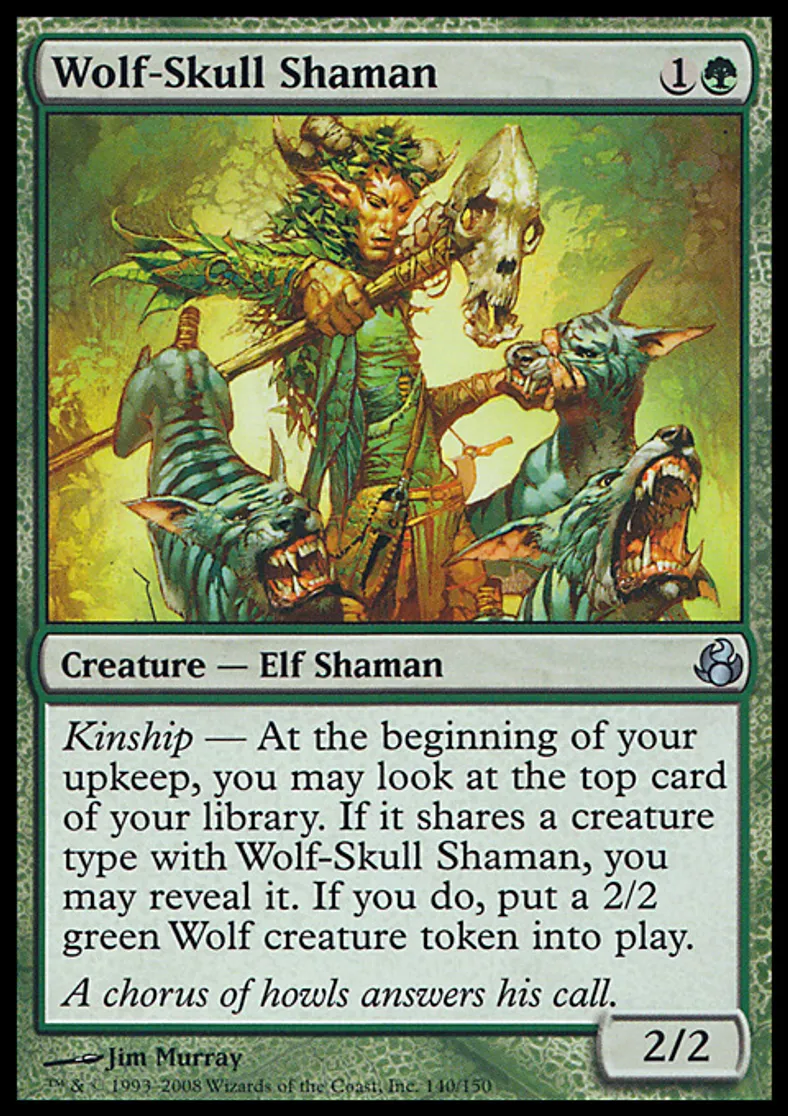 | Oracle Text | Kinship — At the beginning of your upkeep, you may look at the top card of your library. If it shares a creature type with Wolf-Skull Shaman, you may reveal it. If you do, put a 2/2 green Wolf creature token onto the battlefield. | ||