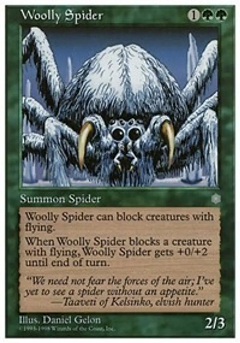 | Oracle Text | Woolly Spider can block creatures with flying. When Woolly Spider blocks a creature with flying, Woolly Spider gets +0/+2 until end of turn. | ||