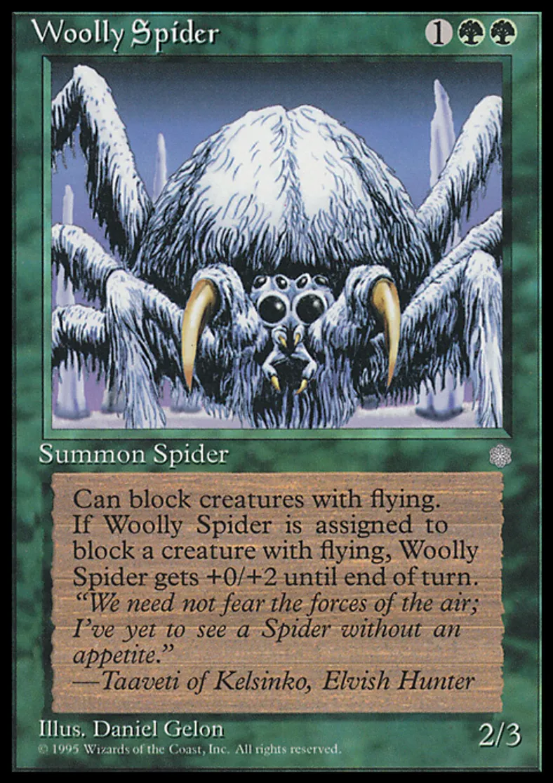 | Oracle Text | Reach (This creature can block creatures with flying.) Whenever Woolly Spider blocks a creature with flying, Woolly Spider gets +0/+2 until end of turn. | ||