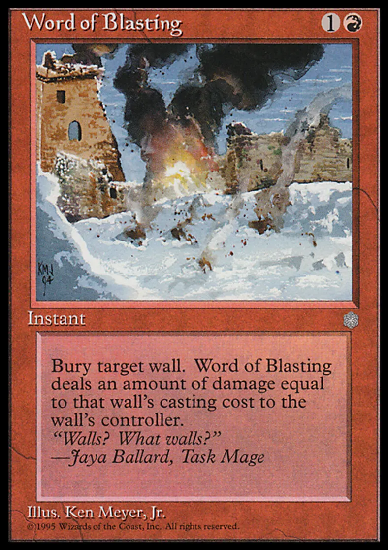 | Oracle Text | Destroy target Wall. It can't be regenerated. Word of Blasting deals damage equal to that Wall's converted mana cost to the Wall's controller. | ||