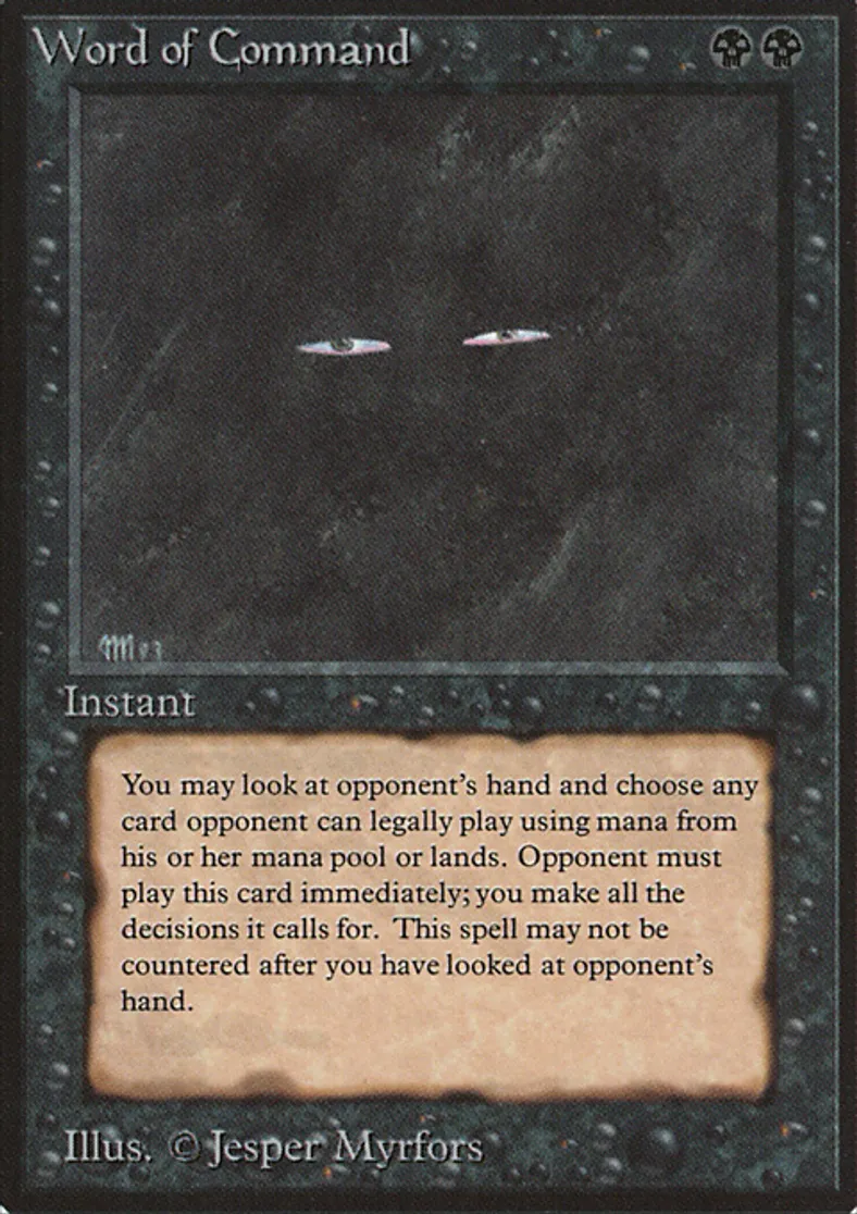 | Oracle Text | Look at target opponent's hand and choose a card from it. You control that player until Word of Command finishes resolving. The player plays that card if able. While doing so, the player can activate mana abilities only if they're from lands he or she controls and only if mana they produce is spent to activate other mana abilities of lands he or she controls and/or play that card. If the chosen card is cast as a spell, you control the player while that spell is resolving. | ||