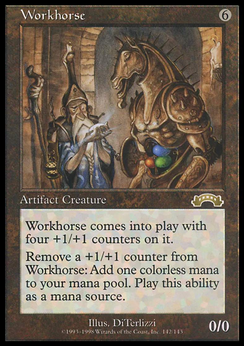 | Oracle Text | Workhorse enters the battlefield with four +1/+1 counters on it. Remove a +1/+1 counter from Workhorse: Add {{1}} to your mana pool. | ||