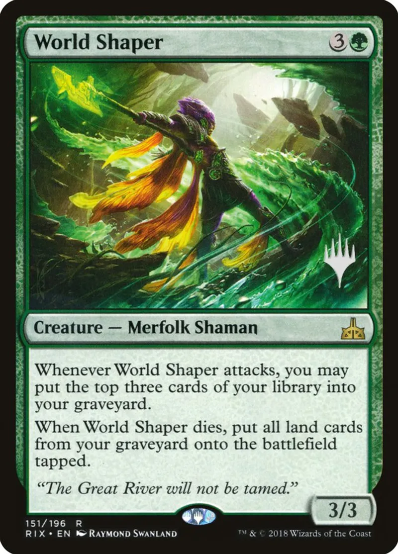 | Oracle Text | When World Shaper attacks, you may put the top three cards of your library into your graveyard. \r\nWhen World Shaper dies, put all land cards from your graveyard onto the battlefield tapped. | ||