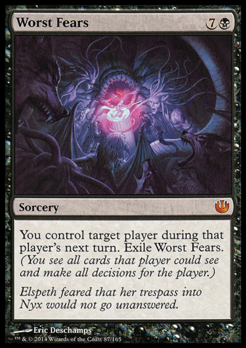| Oracle Text | You control target player during that player's next turn. Exile Worst Fears. (You see all cards that player could see and make all decisions for the player.) | ||