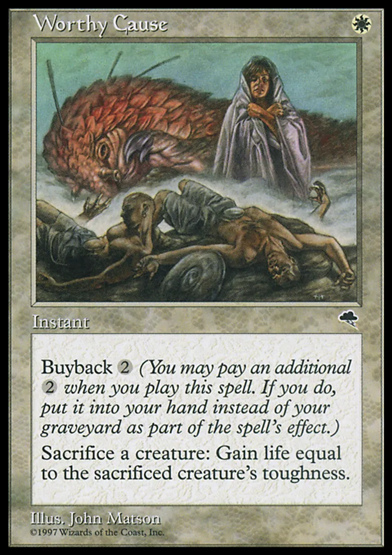 | Oracle Text | Buyback {{2}} (You may pay an additional {{2}} as you cast this spell. If you do, put this card into your hand as it resolves.) As an additional cost to cast Worthy Cause, sacrifice a creature. You gain life equal to the sacrificed creature's toughness. | ||