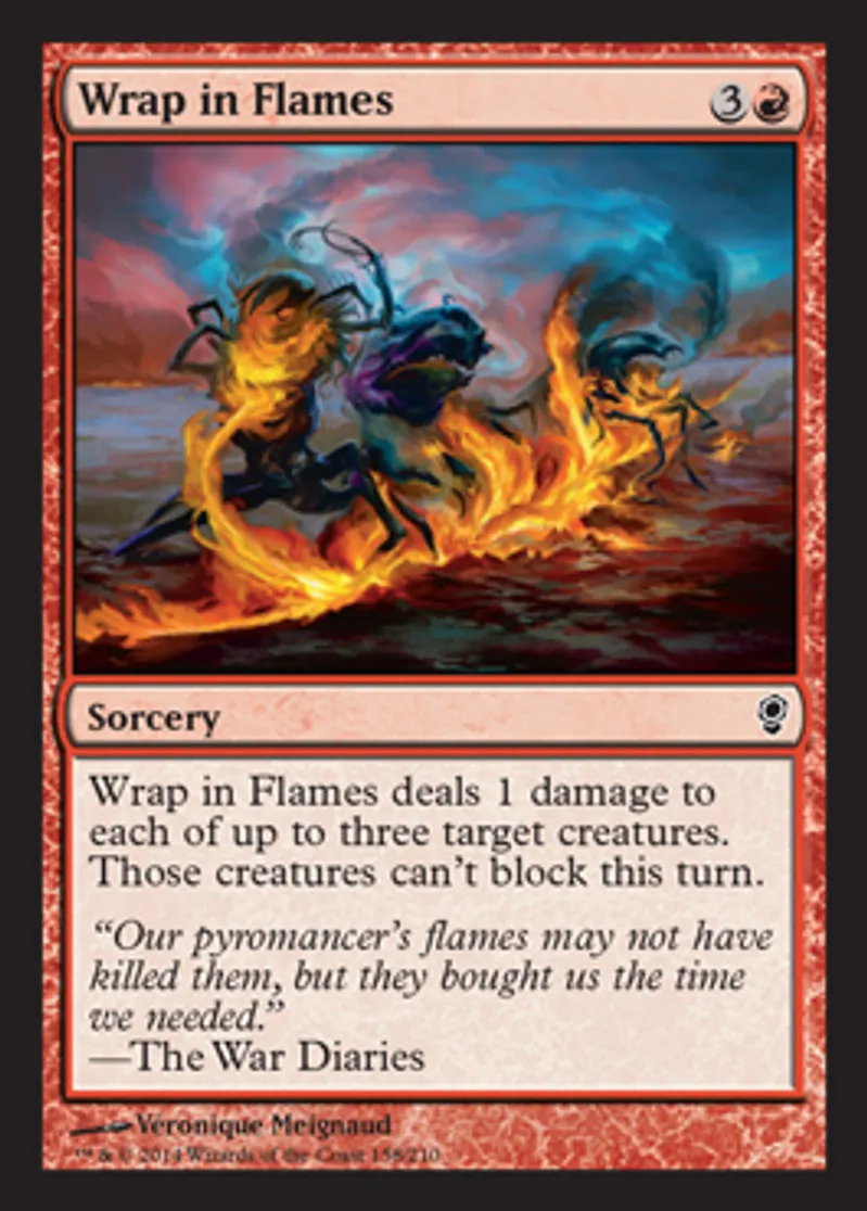 | Oracle Text | Wrap in Flames deals 1 damage to each of up to three target creatures. Those creatures can't block this turn. | ||