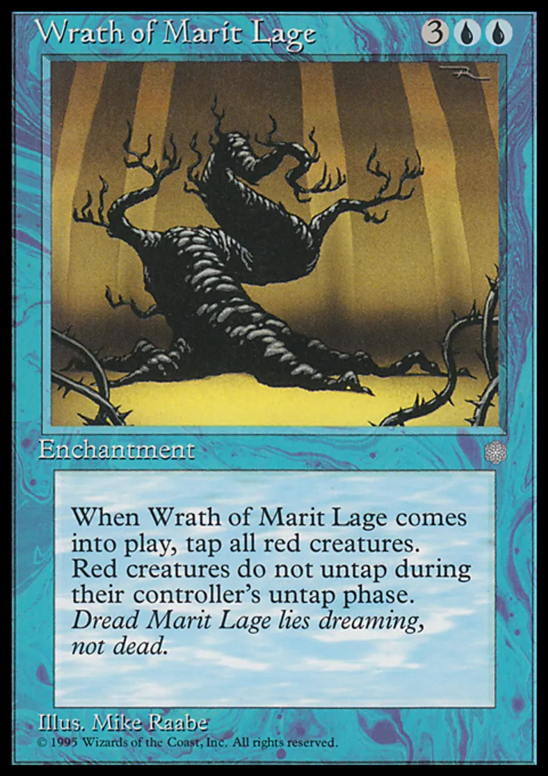 | Oracle Text | When Wrath of Marit Lage enters the battlefield, tap all red creatures. Red creatures don't untap during their controllers' untap steps. | ||