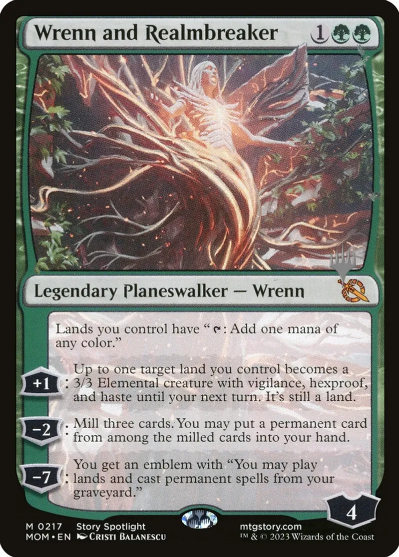 Magic: the Gathering (mtg) Mythic Rare Legendary Planeswalker — Wrenn Wrenn and Realmbreaker from Promo Pack: March of the Machine (pMOM) last updated 2026-02-24 15:43:36