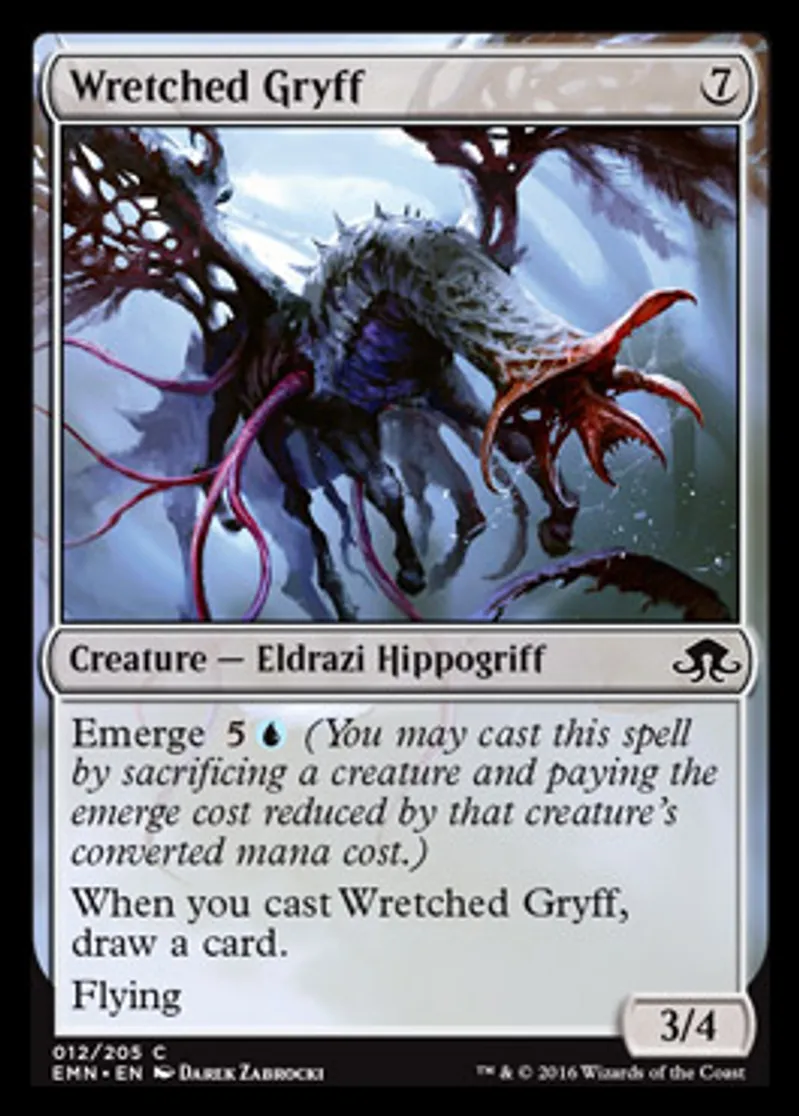 | Oracle Text | Emerge {{5}}{{u}} (You may cast this spell by sacrificing a creature and paying the emerge cost reduced by that creature's converted mana cost.) When you cast Wretched Gryff, draw a card. Flying | ||