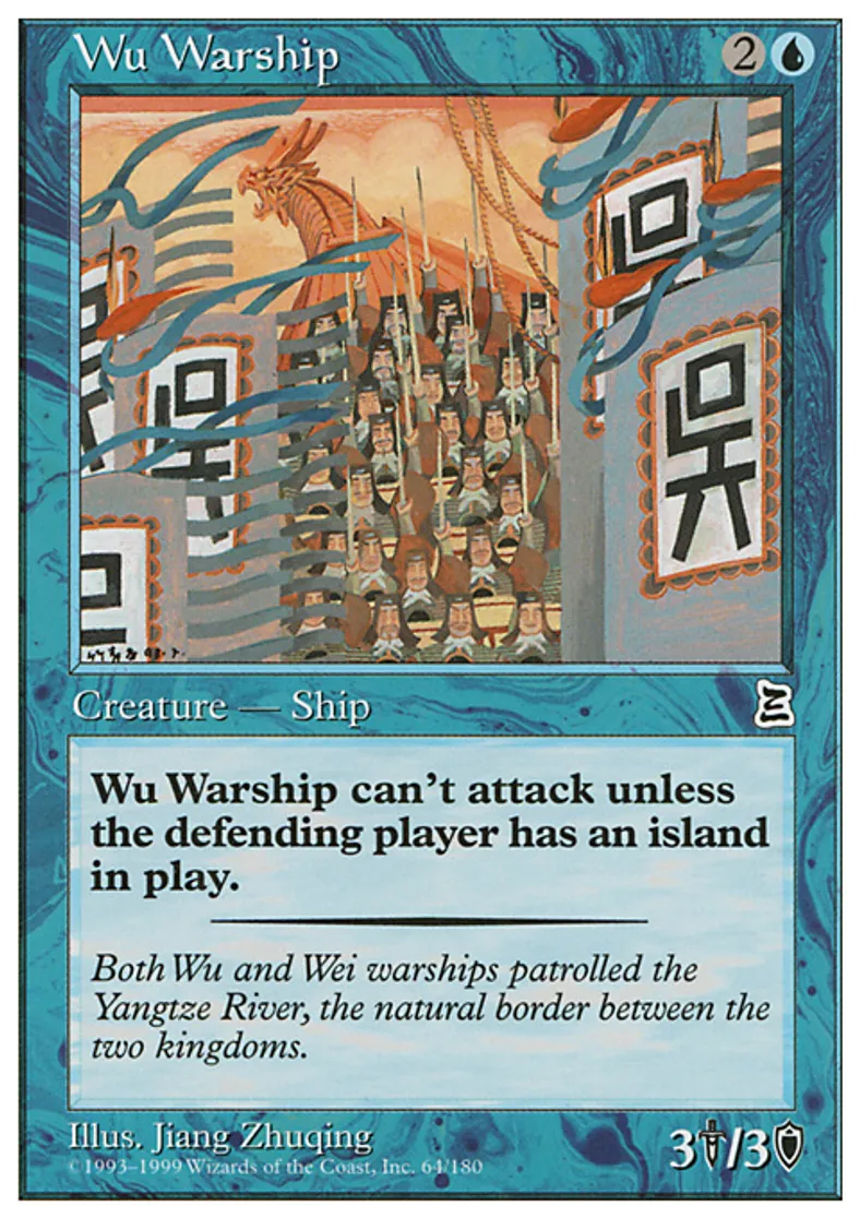 | Oracle Text | Wu Warship can't attack unless defending player controls an Island. | ||