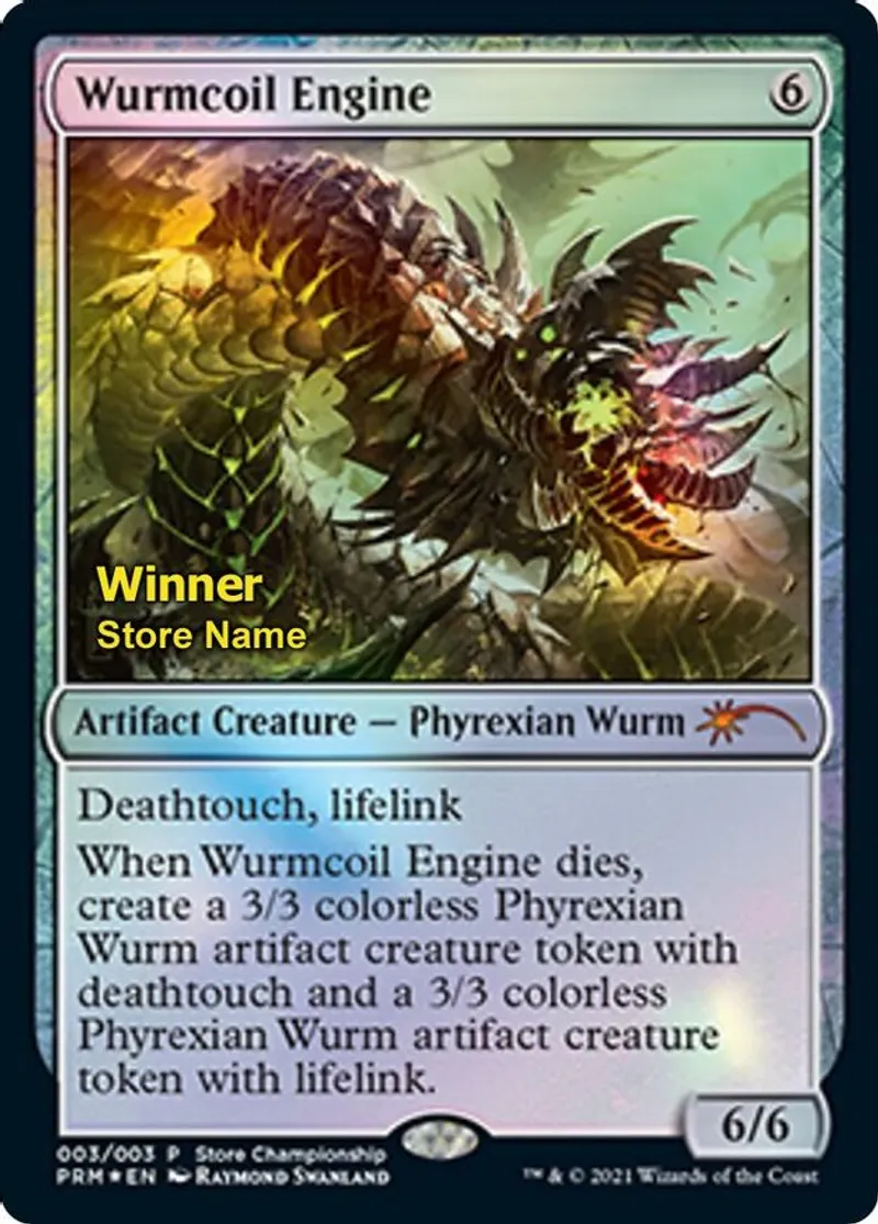 | Oracle Text | please note: this printing of wurmcoil engine features a metallic winner stamp commemorating winning a store championship and a store name. the store name on the card you will receive will be random. for a non-randomized version of this store championship promo, please shop listings with photos.