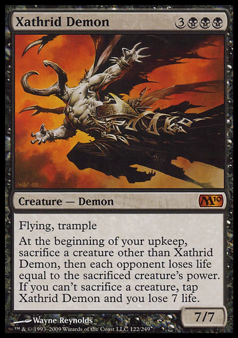 | Oracle Text | Flying, trample At the beginning of your upkeep, sacrifice a creature other than Xathrid Demon, then each opponent loses life equal to the sacrificed creature's power. If you can't sacrifice a creature, tap Xathrid Demon and you lose 7 life. | ||