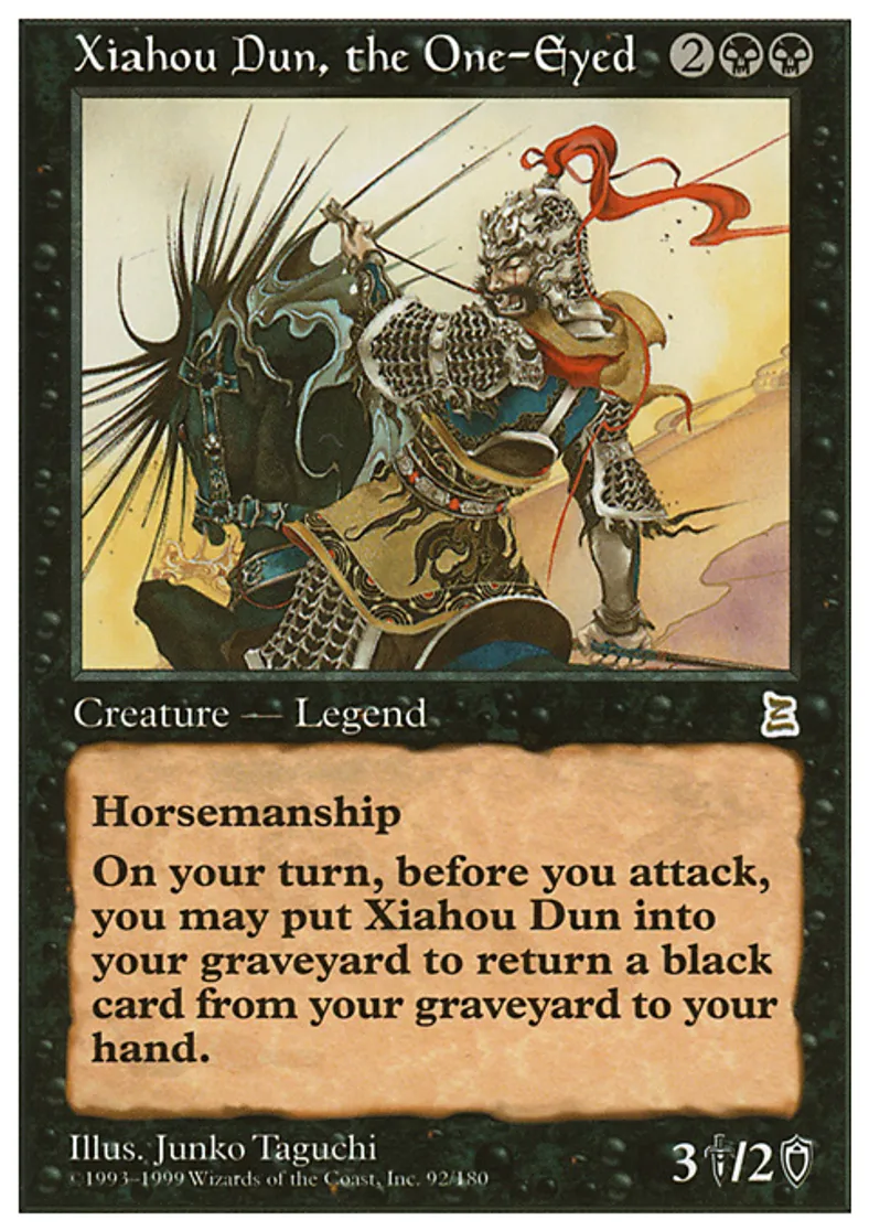 | Oracle Text | Horsemanship (This creature can't be blocked except by creatures with horsemanship.) Sacrifice Xiahou Dun, the One-Eyed: Return target black card from your graveyard to your hand. Activate this ability only during your turn, before attackers are declared. | ||
