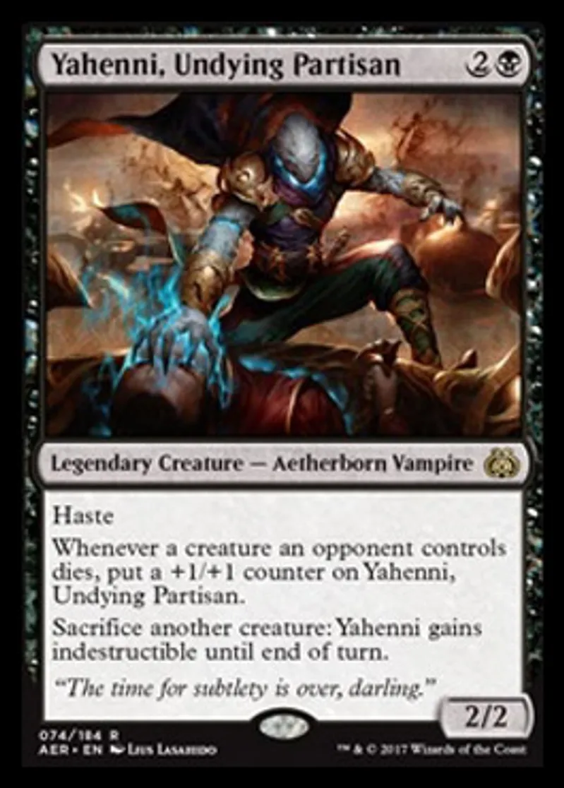 Magic: the Gathering (mtg) Rare Legendary Creature - Aetherborn Vampire Yahenni, Undying Partisan from Aether Revolt (AER) last updated 2026-02-25 16:04:03