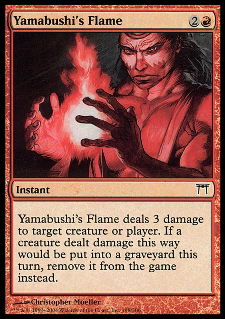 | Oracle Text | Yamabushi's Flame deals 3 damage to target creature or player. If a creature dealt damage this way would die this turn, exile it instead. | ||
