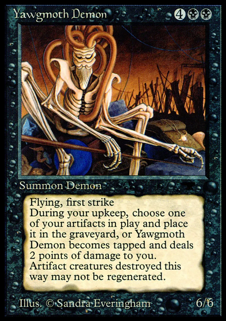 | Oracle Text | Flying (This creature can't be blocked except by creatures with flying or reach.) First strike (This creature deals combat damage before creatures without first strike.) At the beginning of your upkeep, you may sacrifice an artifact. If you don't, tap Yawgmoth Demon and it deals 2 damage to you. | ||