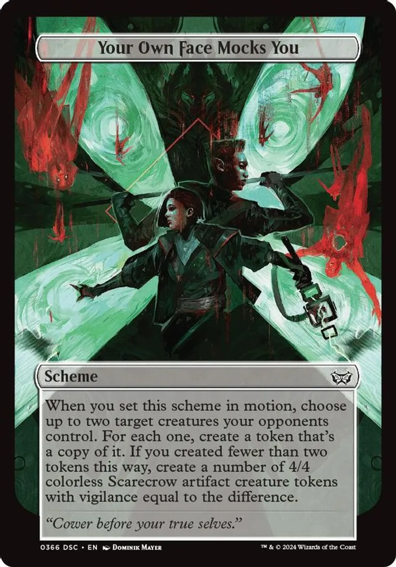 | Oracle Text | when you set this scheme in motion, choose up to two target creatures your opponents control. for each one, create a token that's a copy of it. if you created fewer than two tokens this way, create a number of 4/4 colorless scarecrow artifact creature tokens with vigilance equal to the difference. | ||