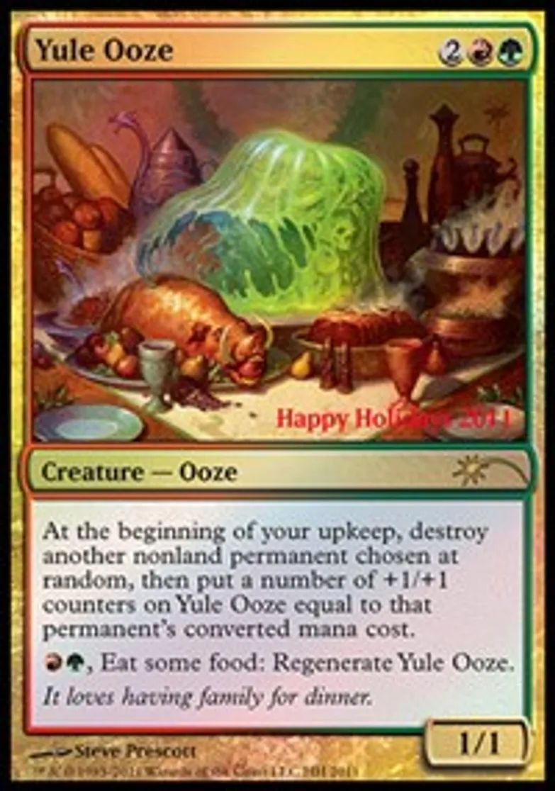 | Oracle Text | At the beginning of your upkeep, destroy another nonland permanent at random, then put a number of +1/+1 counters on Yule Ooze equal to that permanent's converted mana cost.