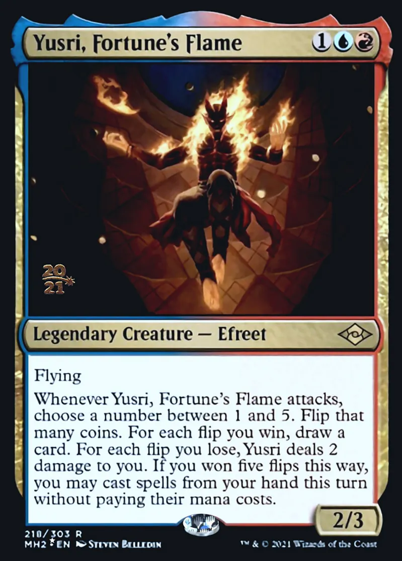 Whenever Yusri, Fortune's Flame attacks, choose a number between 1 and 5. Flip that many coins. For each flip you win, draw a card. For each flip you lose, Yusri deals 2 damage to you. If you won five flips this way, you may cast spells from your hand this turn without paying their mana costs. | ||