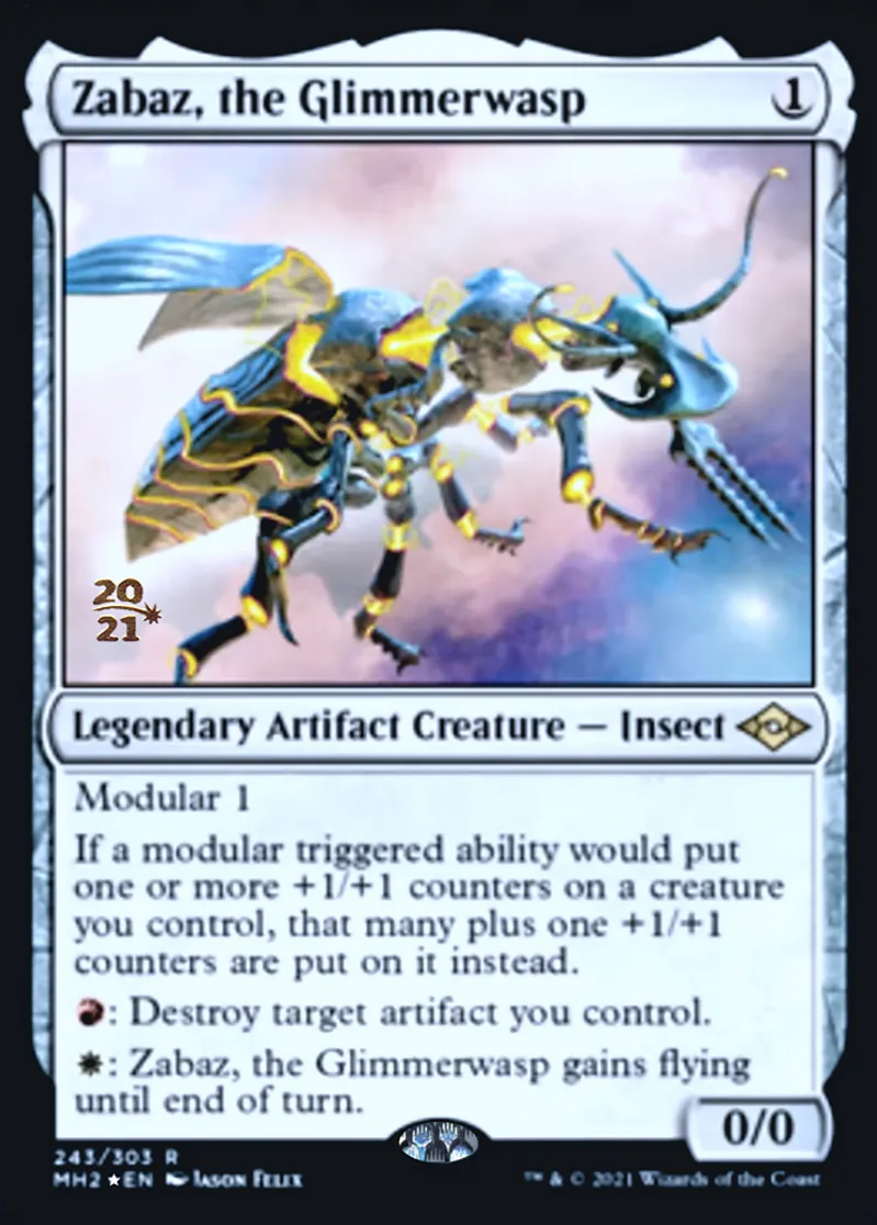 Magic: the Gathering (mtg) Rare Legendary Artifact Creature — Insect Zabaz, the Glimmerwasp from Prerelease Cards (pPRE) last updated 2026-02-21 16:39:32