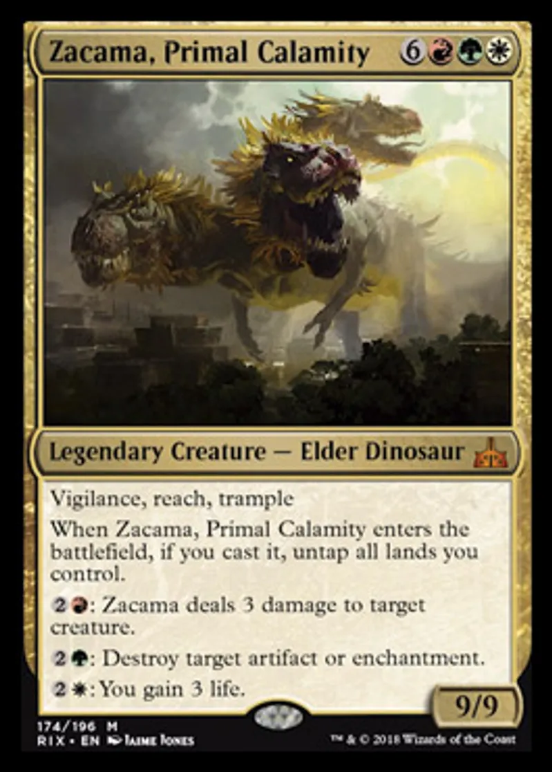 | Oracle Text | Vigilance, reach, trample When Zacama, Primal Calamity enters the battlefield, if you cast it, untap all lands you control. {{2}}{{r}}: Zacama deals 3 damage to target creature. {{2}}{{g}}: Destroy target artifact or enchantment. {{2}}{{w}}: You gain 3 life. | ||