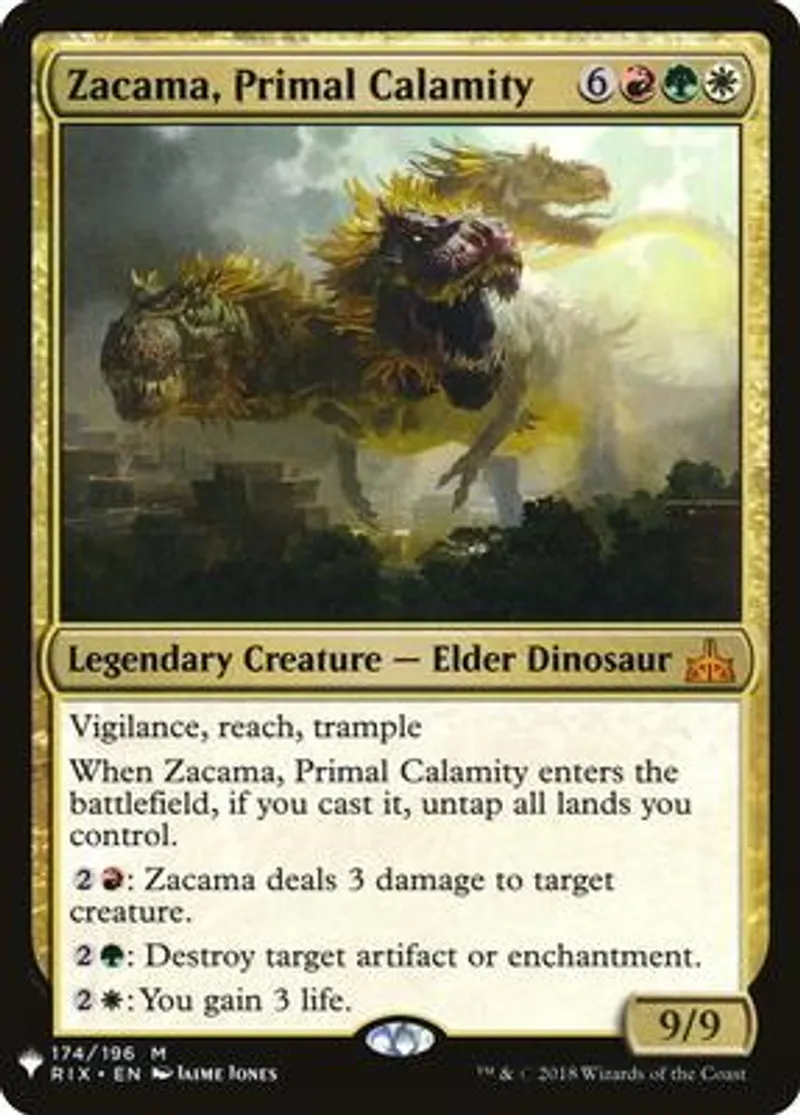 Magic: the Gathering (mtg) Mythic Rare Legendary Creature - Elder Dinosaur Zacama, Primal Calamity from The List (PLIST) last updated 2026-02-24 14:54:02