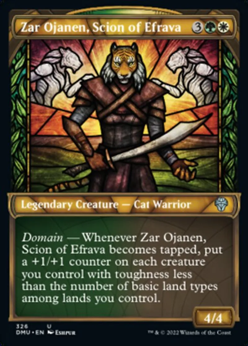 | Oracle Text | Domain — Whenever Zar Ojanen, Scion of Efrava becomes tapped, put a +1/+1 counter on each creature you control with toughness less than the number of basic land types among lands you control. | ||