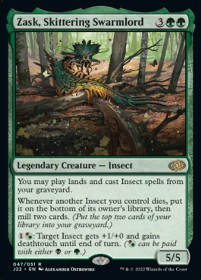 Magic: the Gathering (mtg) rare Legendary Creature — Insect Zask, Skittering Swarmlord from Jumpstart 2022 (j22) last updated 2026-02-24 14:25:32