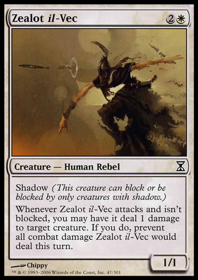 | Oracle Text | Shadow (This creature can block or be blocked by only creatures with shadow.) Whenever Zealot il-Vec attacks and isn't blocked, you may have it deal 1 damage to target creature. If you do, prevent all combat damage Zealot il-Vec would deal this turn. | ||