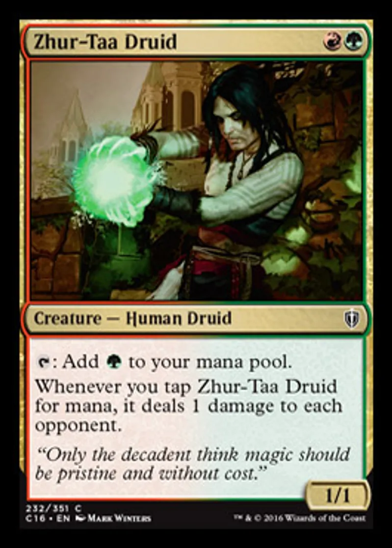| Oracle Text | {{t}}: Add {{g}} to your mana pool. Whenever you tap Zhur-Taa Druid for mana, it deals 1 damage to each opponent. | ||