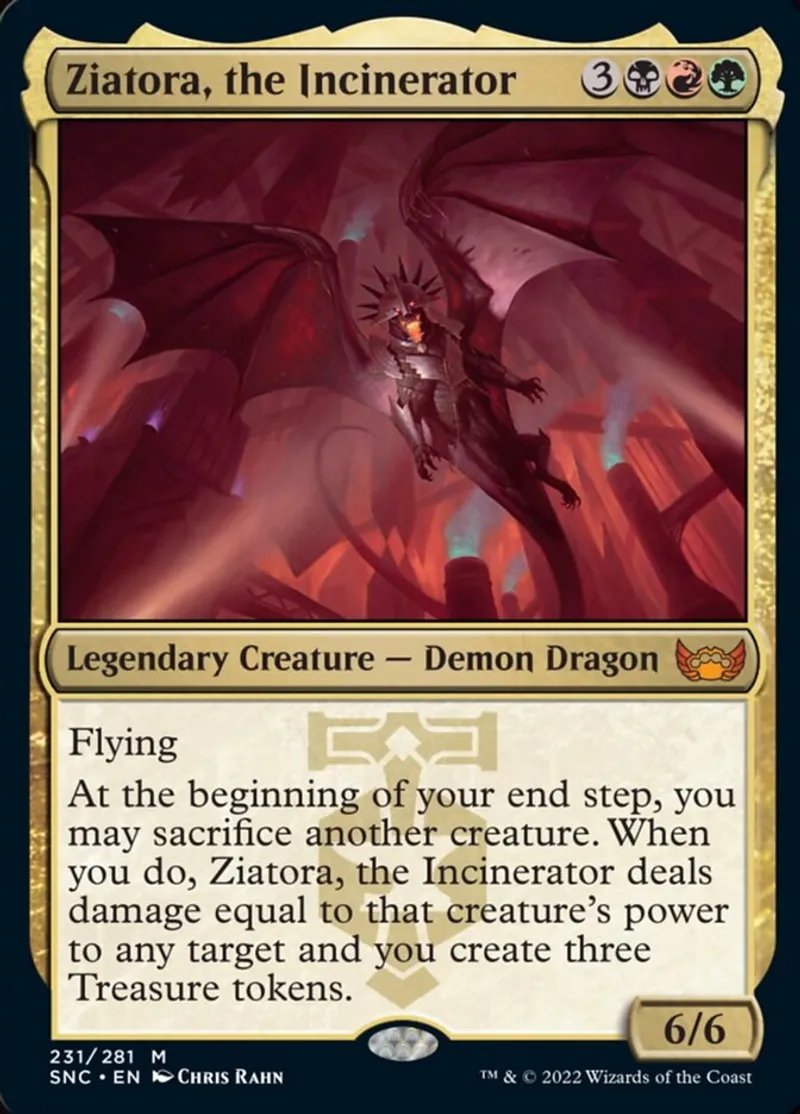 At the beginning of your end step, you may sacrifice another creature. When you do, Ziatora, the Incinerator deals damage equal to that creature's power to any target and you create three Treasure tokens. | ||