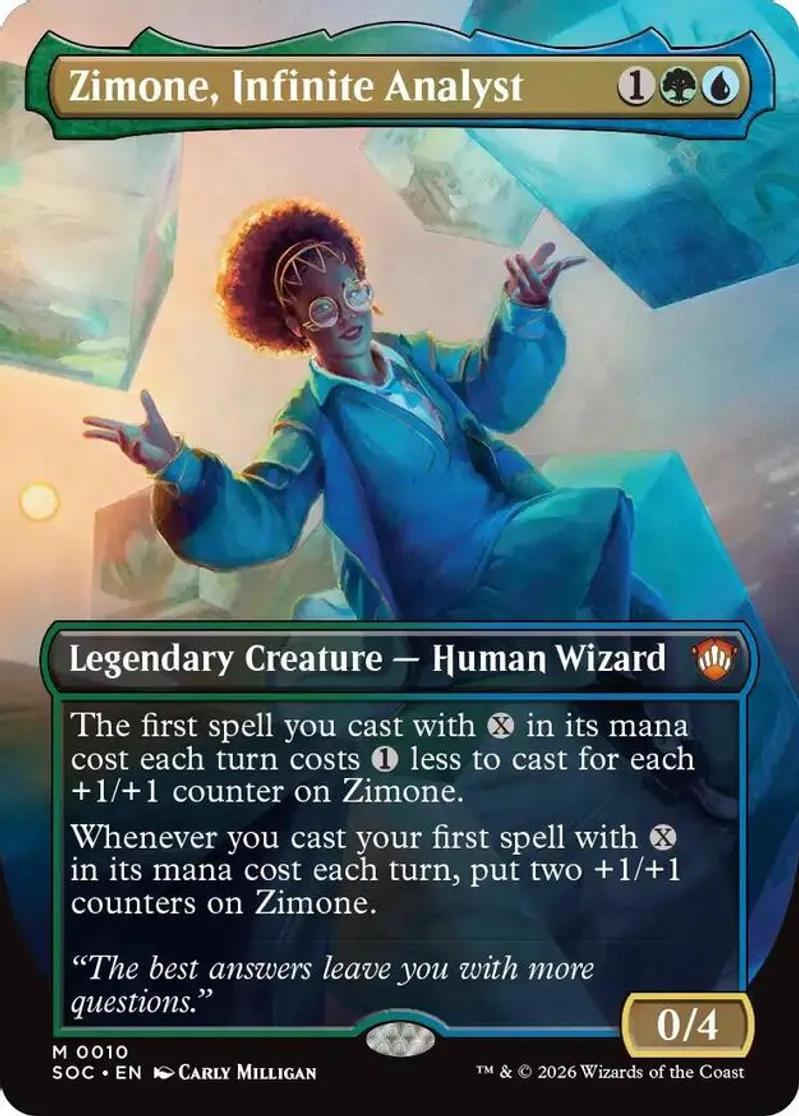 Zimone, Infinite Analyst (Borderless) is a Mythic Rare in the set Commander: Secrets of Strixhaven.