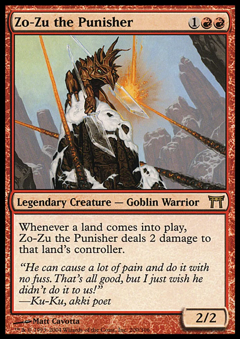 | Oracle Text | Whenever a land enters the battlefield, Zo-Zu the Punisher deals 2 damage to that land's controller. | ||