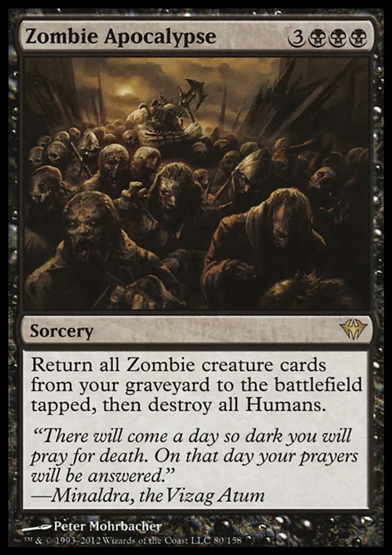 | Oracle Text | Return all Zombie creature cards from your graveyard to the battlefield tapped, then destroy all Humans. | ||