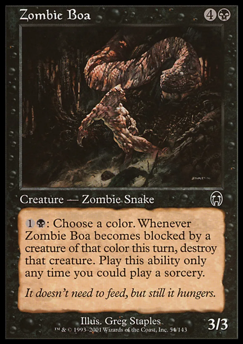 | Oracle Text | {{1}}{{b}}: Choose a color. Whenever Zombie Boa becomes blocked by a creature of that color this turn, destroy that creature. Activate this ability only any time you could cast a sorcery. | ||