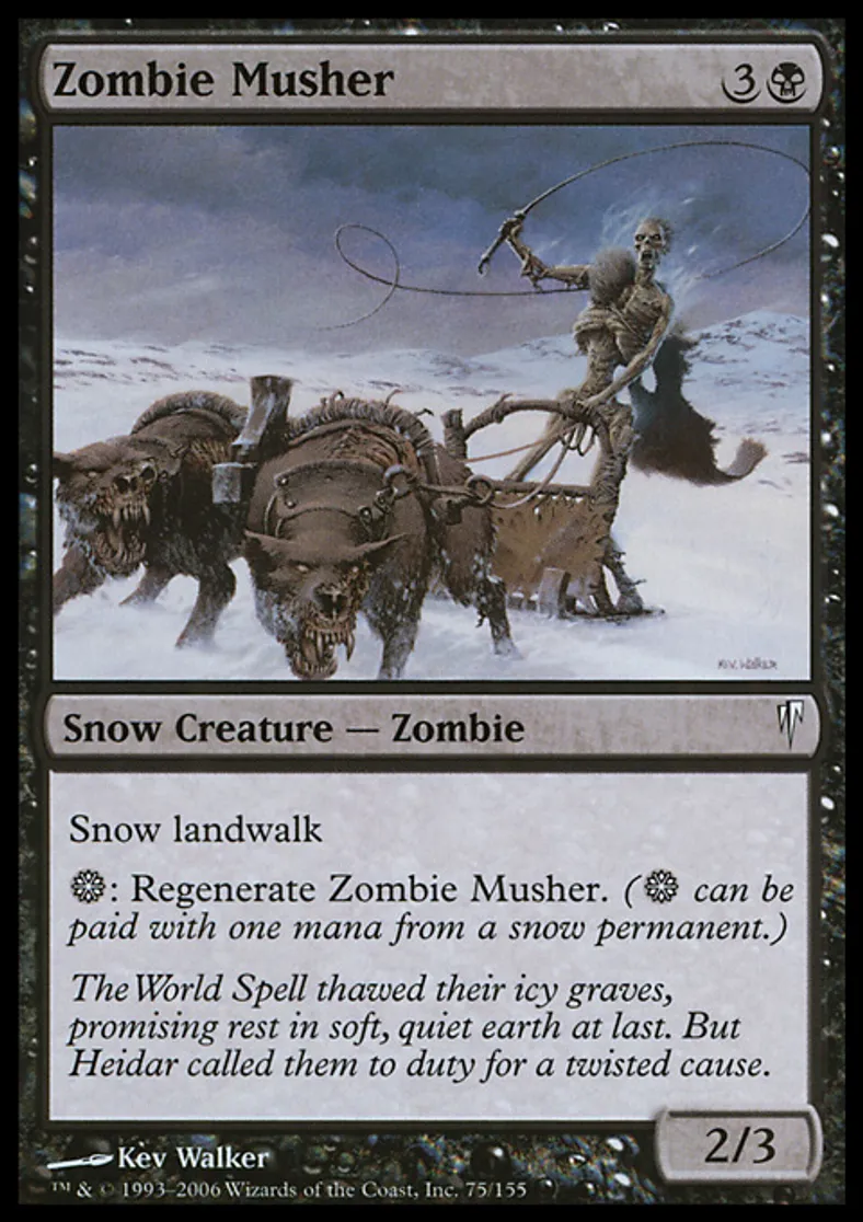 | Oracle Text | Snow landwalk {{Snow}}: Regenerate Zombie Musher. ({{Snow}} can be paid with one mana from a snow permanent.) | ||